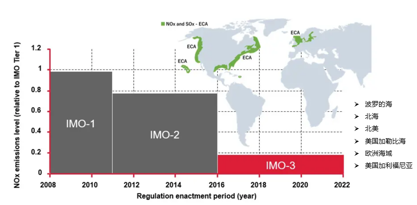 針對(duì)國(guó)際:根據(jù)國(guó)際海事組織(IMO)海上環(huán)境保護(hù)委員會(huì)第66屆會(huì)議(MEPC66)以及MEPC.251(66)決議通過MARPOL附則VI和2008NOx技術(shù)規(guī)則修正案,并于2015年9月1日起生效實(shí)施。進(jìn)入排放控制區(qū)的船舶滿足《國(guó)際防止船舶造成污染公約》第三階段氮氧化物排放限值要求。